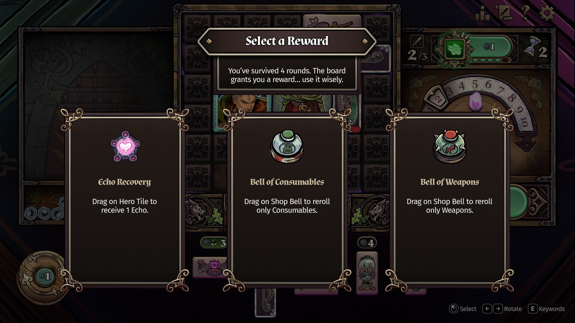 Kaufe und platziere mächtige Waffen-, Gegenstands- und Schmuckstückkacheln, um mächtige Kombinationen zu entfesseln und deinen Helden mit verschiedenen Fähigkeiten zu upgraden.